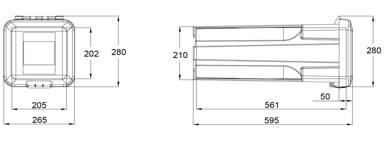 - Außenmaße: Höhe 280 mm x Breite 265 mm x Tiefe 595 mm
