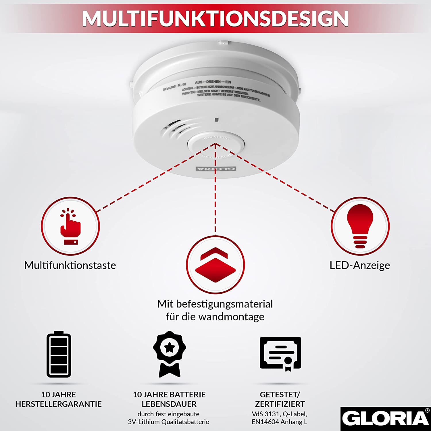 Gloria R-10 Rauchwarnmelder mit 10- Jahres Lithium Batterie, Rauchmelder