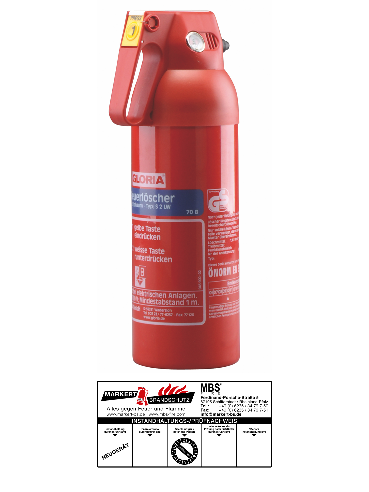 Gloria S2LW 2l Schaumlöscher inkl. Plakette und mit Drahthalter / KFZ Halter