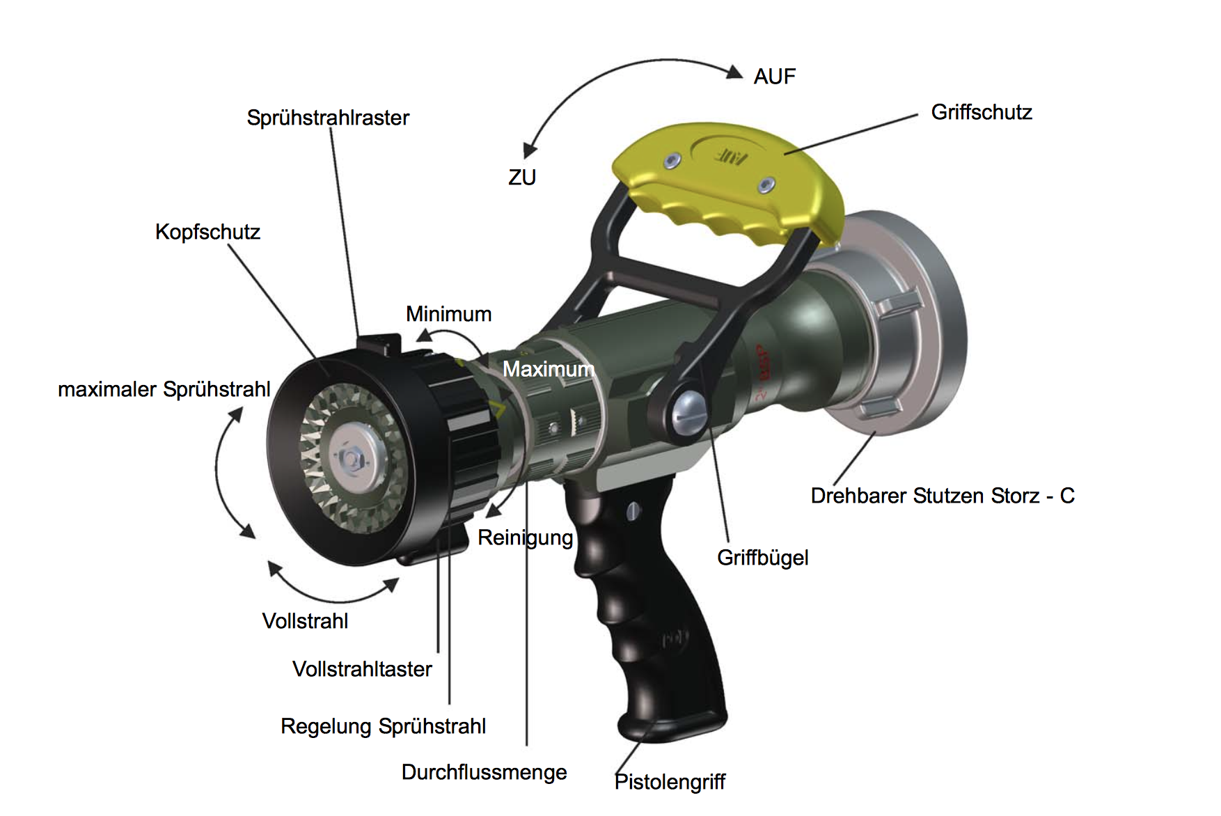 Durch Drehbewegung können Sie an diesem Ring zwischen folgenden Einstellmöglichkeiten wählen: 60, 130, 250, 400 l/min sowie Reinigungsstellung. Die Reinigungsstellung dient dazu, die Strahlrohröffnung in ihren größtmöglichen Öffnungs- zustand zu versetzen, um eventuelle Verstopfungen durch verunreinigtes Wasser kurzfristig beseitigen zu können. Sollten Sie dies während des Einsatzes tun müssen, bedenken Sie, dass sich die Wurfweite des Strahles deutlich verringert. Unsere Strahlrohre sind natürlich dem deutschen und dem europäischen Standard entsprechend mit l/min gekennzeichnet. Durch unser internationales Business stellt die Kennzeichnung in GPM oder die Kennzeichnung mit anderen Wassermengen kein Problem dar.