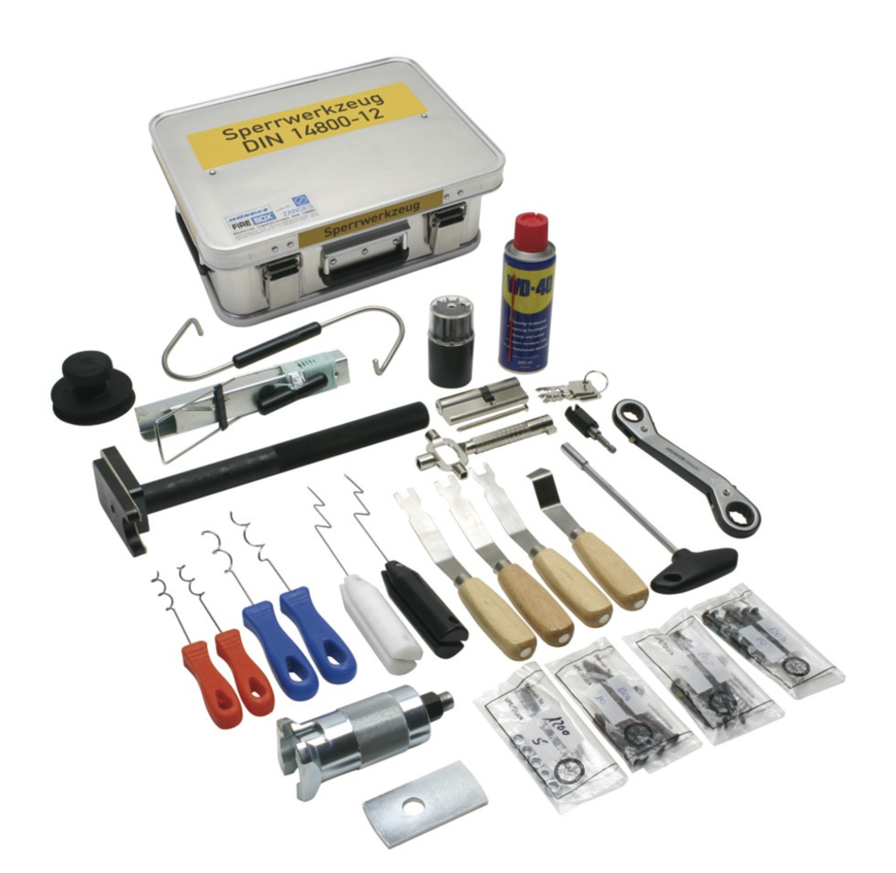 Der Sperrwerkzeugkasten enthält alle wichtigen Werkzeuge und Hilfsmittel um verschlossene Türen und Fenster schnell zu öffnen. Entweder durch zerstörungsfreie Manipulation oder durch das Ziehen der Schlösser.